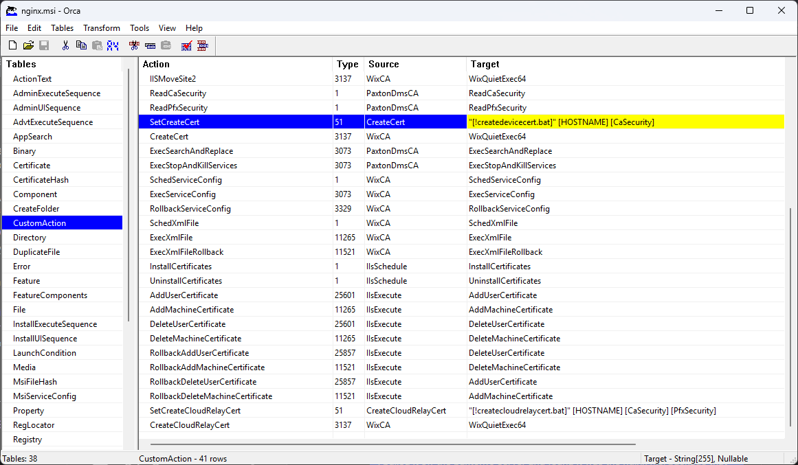ORCA showing the CustomAction table
